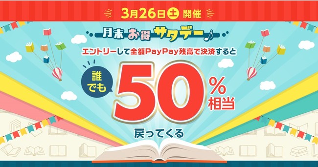 電子書籍販売サイト「ebookjapan」をヤフー株式会社と協力して運営する、株式会社イーブックイニシアティブジャパン(本社:東京都千代田区、代表取締役社長:高橋将峰(たかはしまさみね))は、ebookjapanで「PayPay残高」を使って電子書籍を購入すると、決済金額に対して50%相当のPayPayボーナスを付与する「月末お得サタデー 誰でもお得に買えるキャンペーン」を、2022年3月26日(土)に実施します。