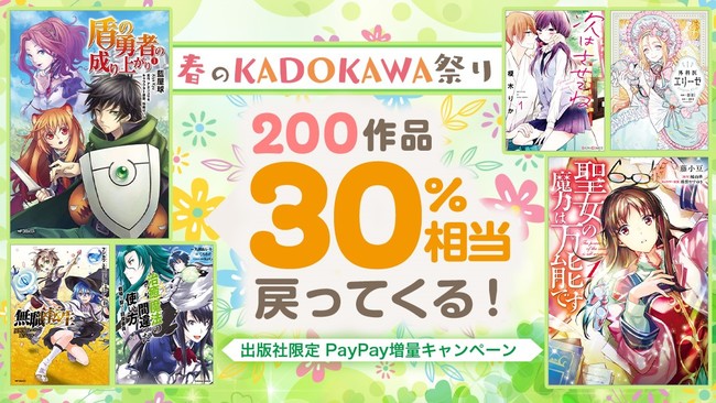 電子書籍販売サイト「ebookjapan」をヤフー株式会社と協力して運営する、株式会社イーブックイニシアティブジャパン(本社:東京都千代田区、代表取締役社長:高橋将峰(たかはしまさみね))は、ebookjapanでPayPay連携すると、誰でも決済金額に対して30%相当のPayPayボーナスを付与する出版社限定PayPay増量キャンペーン「春のKADOKAWA祭り」を、2022年3月27日(日)~2022年3月29日(火)の3日間実施します。対象作品は話題の異世界ファンタジー『盾の勇者の成り上がり』など含めた200作品以上。このお得な機会に是非お買い求めください。