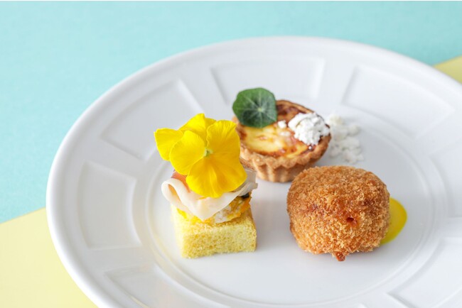 ・セイボリー:シェフ特製3種のセイボリー(トマトバジルリゾットのライスコロッケ/カボチャと生ハムのサンド/本日のキッシュ)