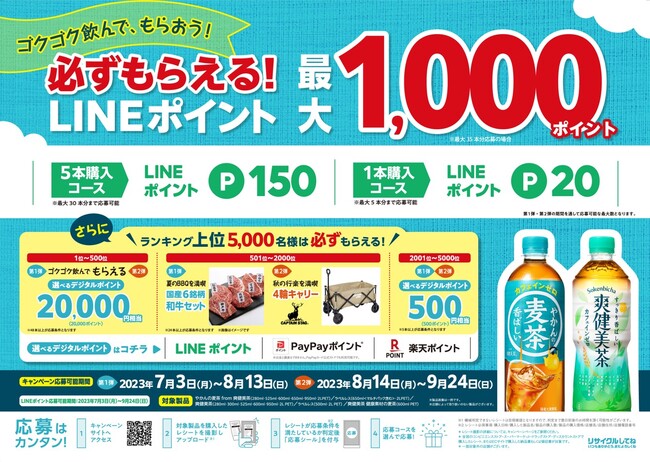 「やかんの麦茶」など、対象製品を“ゴクゴク”飲めば飲むほど応募できるレシートキャンペーンを実施。対象製品を購入したレシート、もしくはECサイトなどで購入した納品書・領収書を撮影して応募すると、最大1,000ポイント*1分のLINEポイントが必ずもらえます。さらに、キャンペーン期間中の購入本数上位5,000名様は、その順位に応じて、選べるデジタルポイントや、ゴクゴク飲みたくなるシーンにぴったりな賞品が必ずもらえます*?。対象製品を飲めば飲むほど賞品がもらえるチャンスが広がる、ランキング形式のキャンペーンです。