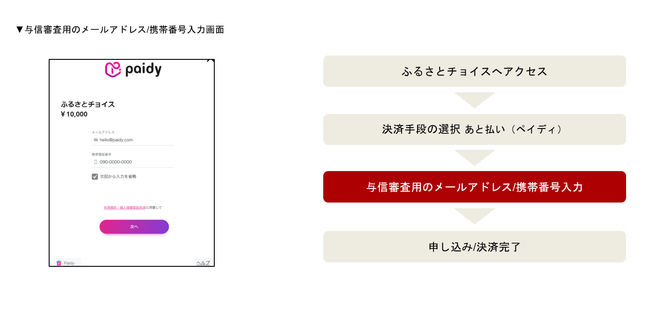 「ペイディ」は「お買いものに『めんどくさい』はいらない。」をミッションに、すべての方が楽しく賢く決済ができる環境を提供することを目指しています。ふるさとチョイスの利用者は、ペイディの利用により、携帯電話番号とメールアドレスのみで簡単に決済ができ、利用した金額は翌月にまとめて「あと払い」が可能です。ペイディアプリで本人確認を実施すると、利用金額を分割手数料無料(注1)で3回に分けてあと払いできるサービス「3回あと払い」も利用可能です。