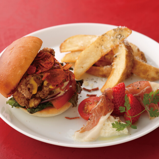 レストランならではのセイボリーは、ワインとも相性のよい「苺のカプレーゼ」や奥深いスパイスが癖になる「オリジナルスパイシーチキンバーガー」などご用意。苺を添えたウェルカムドリンクで華やかにスタートした後は、ワインやハーブティーなどお好みのドリンクを選んで心ゆくまで贅沢なひとときをお過ごしください。