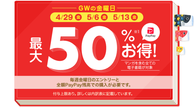 今回の「GWは全額PayPay残高決済でお得キャンペーン」と組み合わせることで、期間中の金曜日(4月29日、5月6日、5月13日)に「PayPay残高」で電子書籍を購入すると、誰でも最大30%、Yahoo!プレミアム会員であれば最大40%、ソフトバンクもしくはワイモバイルスマホユーザーは最大50%お得になります。