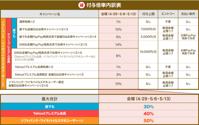 ※5「GWは全額PayPay残高決済でお得キャンペーン」のPayPayポイントの付与上限は、開催日ごと1日あたり10,000円相当です。Yahoo!プレミアム会員、ソフトバンク・ワイモバイルスマホユーザーは20%相当、それ以外の方は14%相当のPayPayポイントが戻ってきます。