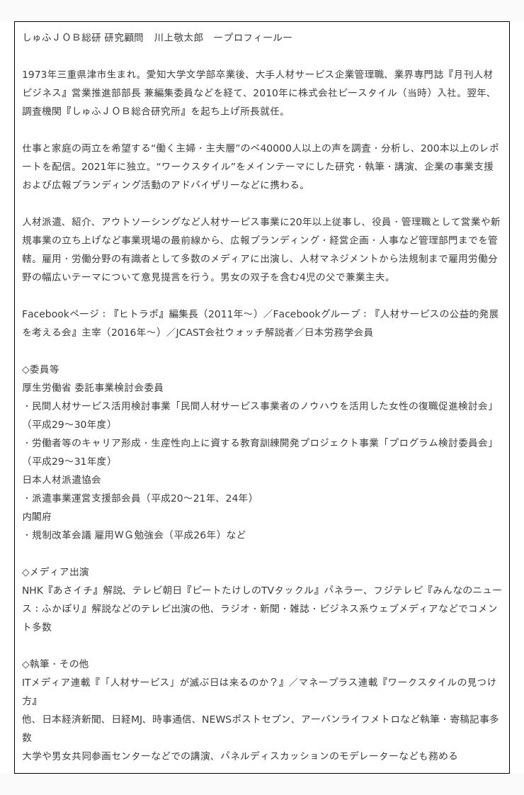 ■しゅふJOB総研 研究顧問 川上敬太郎より
