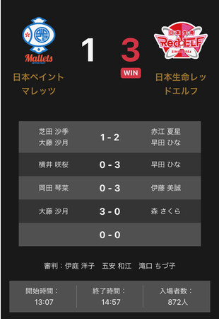 の試合結果は1-3で日本生命レッドエルフが勝利しました。