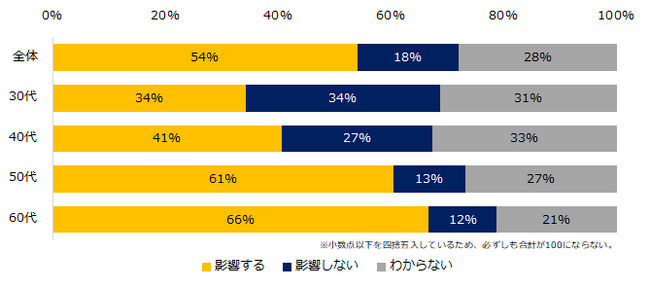 転職先を決める上で企業の「高年齢者雇用確保」の措置が影響するかを伺うと、54%が「影響する」と回答。年代別に見ると、30代は34%に対し、60代は2倍近い66%で、年代が上がるごとに影響度合いが高まることが分かりました。どのような措置を講じている企業に転職したいか伺うと、「定年の引上げ」(34%)が最多でした。