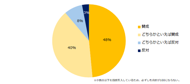 「65歳・70歳までの雇用確保」など、働く意欲がある高年齢者が働きやすい環境整備を国が進めていることに関して賛成か反対かを伺うと、88%が「賛成」(賛成:48%、どちらかといえば賛成:40%)と回答しました。