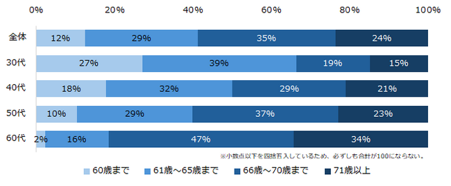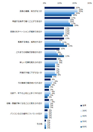 「あなた自身は、何歳まで働きたいと思いますか?」と伺うと、「66歳〜70歳まで」が35%で最多でした。「61歳以降も働きたい」と回答した方に理由を伺うと、上位は「健康・体力維持のため」「年金だけでは生活できないから」(いずれも15%)でした。続けて、高年齢者として働くことへの不安も伺うと、「自身の健康、体力がもつか」(20%)が最多でした。