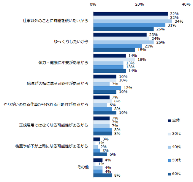 「60歳まで」と回答した方に長く働きたいと思わない理由を伺うと、「仕事以外のことに時間を使いたいから」(32%)が最多でした。