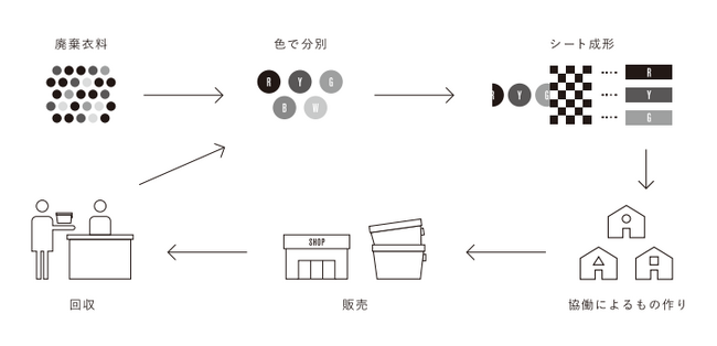 当社は、素材分別が難しい廃棄繊維を色で分けて付加価値のある素材・製品にアップサイクルする Colour Recycle System の開発・研究を行っている「Colour Recycle Network (カラーリサイクルネットワーク)」との協働によって、新製品を開発しました。