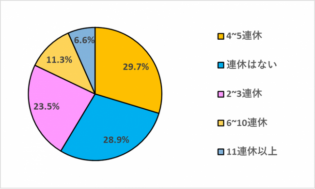 「今年のGWは何連休予定ですか?」という質問に対し、「4〜5連休」が29.7%、次いで「連休はない」が28.9%、「2〜3連休」が23.5%という順になりました。4〜5連休の人が多いようですが、連休はない人も同じ位いらっしゃることが分かりました。