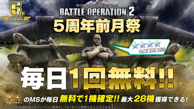 期間中、★2以上のMSが1機確定の無料抽選配給を、毎日1回要請することができます。