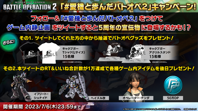 期間中、バトオペ2公式Twitter(@gundambattleope)をフォローの上、ハッシュタグ「#愛機と歩んだバトオペ2」を付けて、『機動戦士ガンダ厶 バトルオペレーション2』のゲーム内静止画や動画を添付してツイートいただくと、抽選でバトオペグッズが当たる他、ゲーム内静止画に関しては7月下旬頃から公開を予定している宣伝物に登場する可能性がございます。