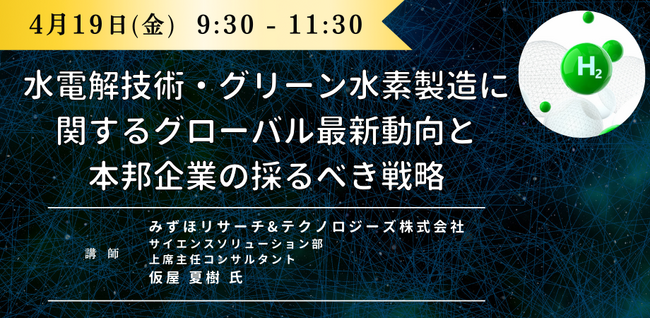 JPI(日本計画研究所)は、みずほリサーチ&テクノロジーズ株式会社 サイエンスソリューション部 上席主任コンサルタント 仮屋 夏樹 氏を招聘し、水電解・グリーン水素の技術・市場動向について詳説いただくセミナーを開催します。