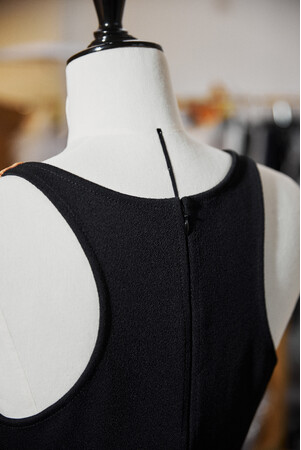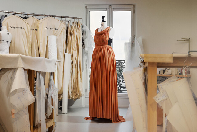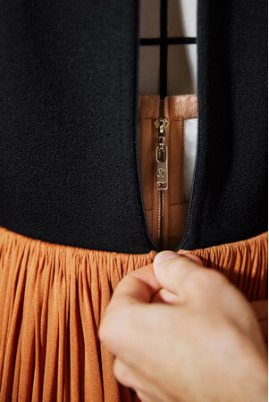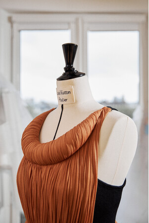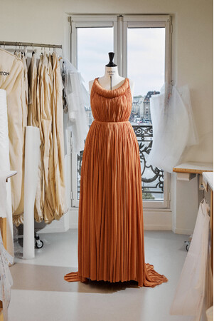超軽量のビスコース・クレープ・ジャージーを使用し、プリーツはすべて手作業によって作られたこのロングドレスは、約20メートルの生地と約250時間をかけて制作されました。ウエストはキュッと絞られ、装飾的なネックラインは半月型の襟で強調されています。