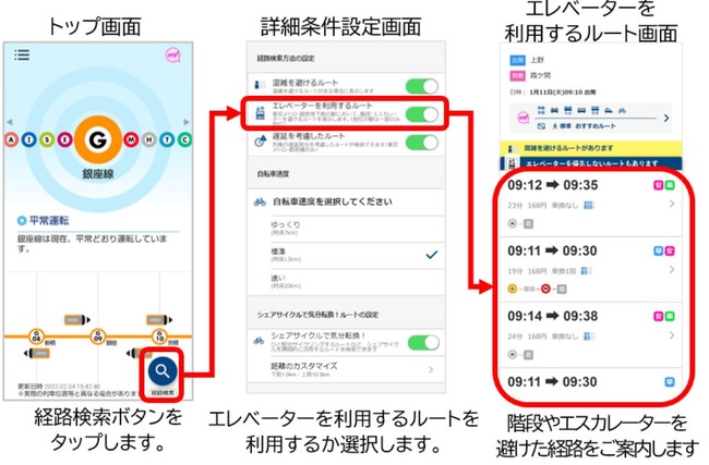 出発地点から到着地点のルート検索時に、東京メトロ及び都営地下鉄の駅において、エレベーターのみを利用するルートをご案内します。これにより大きなお荷物をお持ちのお客様やベビーカーをご利用のお客様を中心に、円滑に移動していただくことができます。