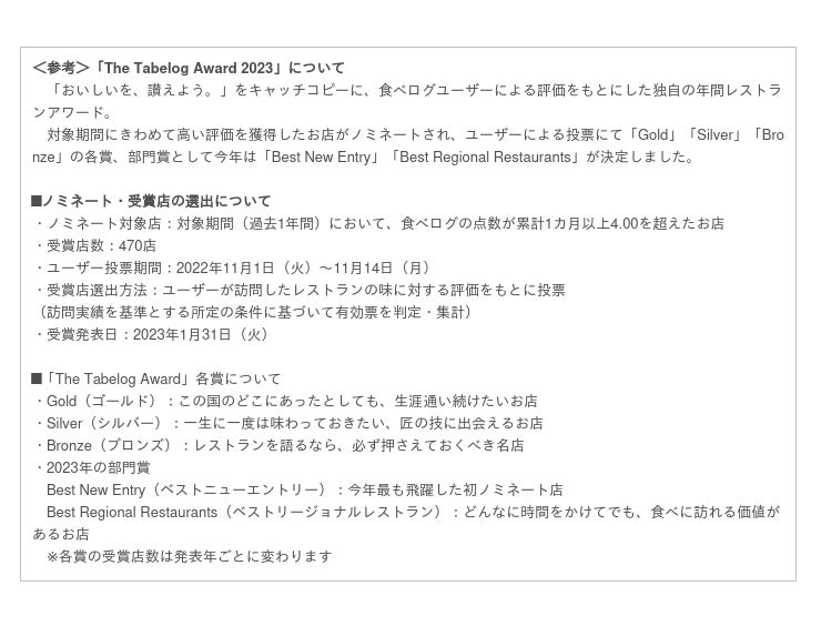 食べログでは、本アワードを開催することにより、外食産業のさらなる活性化につながればと考えています。引き続き、ユーザー・飲食店双方のニーズにお応えできるよう、今後も利便性の向上とサービス拡充に努めてまいります。