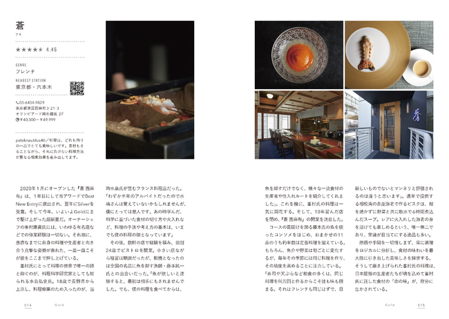店舗情報とともに、各店の逸品やサービスに関するこだわりやポイントなどを美しい写真と併せて紹介します。また「Gold」受賞店のシェフの方々にはそれぞれ、「今後の目標」「理想とする料理人としてのあり方」「思い出の一皿」「愛読書」「今訪れたいお店」などをインタビューしました。