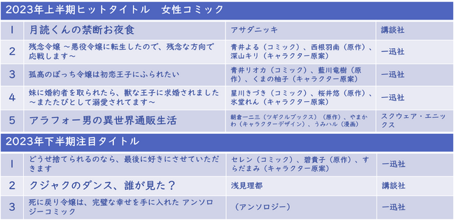 女性コミックは2023年下半期注目タイトルも含め5タイトルに「令嬢」が主人公のタイトルがみられます(2位、3位、4位、注目1位、注目3位)。数年前に悪役令嬢から始まった令嬢ブームの人気はまだまだ健在です。