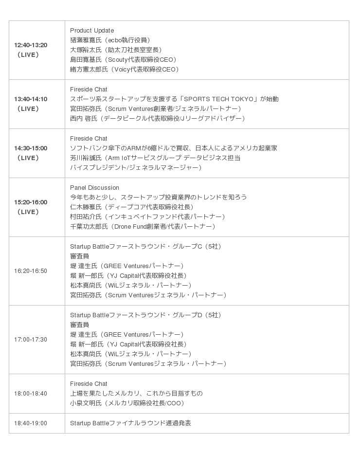 このうちライブ配信対象プログラムは、11月15日(木)11:50〜16:00、11月16日(金)11:50〜16:00と17:40〜18:50のセッションとスタートアップバトル授賞式を予定しています。