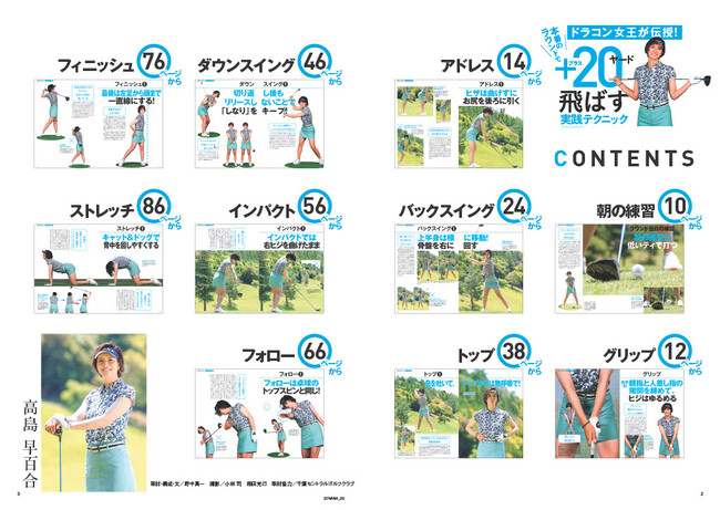 ドライビングコンテストの公式記録365ヤードを持つ女子プロ高島早百合の「今よりプラス20ヤード飛ばす」ムックの第2弾。好評だった基本の次は、実践テクニックがテーマ。ティアップの仕方から始まり、アドレスからフィニッシュまで、スイングのパーツ別に飛ばしのポイントを紹介。ビジュアル重視で、TEXTは最小限にコンパクトにまとめてあるので、見やすく、読みやすい構成です。