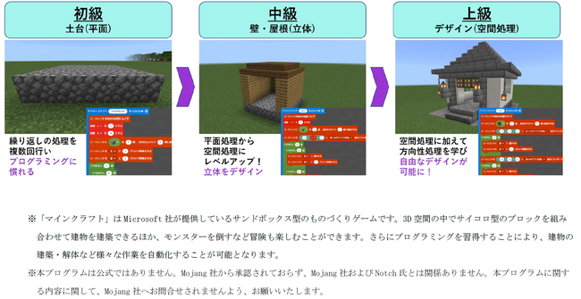 小学生を中心に人気の「マインクラフト」を用い、プログラミングの基本的な概念やロジックを学びながら、演習での「トライ&エラー」を繰り返すことで、失敗を恐れずチャレンジする「自立自走学習」の姿勢を養います。また、教材の中には複数難易度の演習問題を用意しており、お子様のレベルに合わせたプログラミング教育を行います。