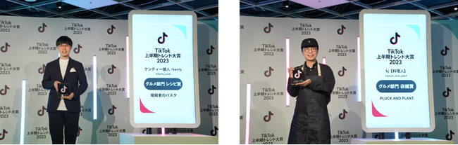 「TikTok上半期トレンド大賞2023」グルメ部門は、「レシピ賞」と「店舗賞」の2つの賞で発表。「レシピ賞」は「暗殺者のパスタ」に決定。レシピ動画が670万回以上再生されたグルメTikTokクリエイターのケンティー健人/kentyが「暗殺者のパスタ」をトレンド化させたTikTokクリエイターを代表して、表彰されました。