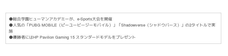 ヒューマンホールディングス株式会社の事業子会社で、教育事業を運営するヒューマンアカデミー株式会社(本社:東京都新宿区、代表取締役:川上 輝之、以下「当社」)が運営する全日制専門校の総合学園ヒューマンアカデミーは、2020年4月より全国7校舎で「e-Sportsカレッジ」を新規開講します。それを記念し、株式会社イード(本社:東京都新宿区、代表取締役:宮川 洋、以下 イード)等と共同で、e-Sports大会『e-Sportsフェス2019〜令和最初の夏祭り〜』(以下「本大会」)を9月8日(日)にオンラインで開催します。