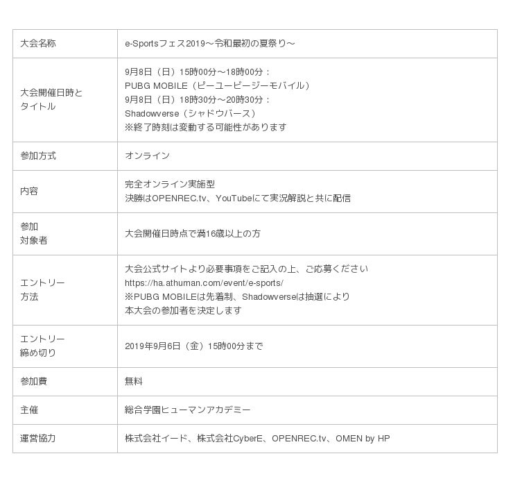 総合学園ヒューマンアカデミー イード、CyberE、OPENREC.tvとe-Sports大会『e-Sportsフェス2019〜令和最初の夏祭り〜』を9月8日(日)にオンラインで開催
