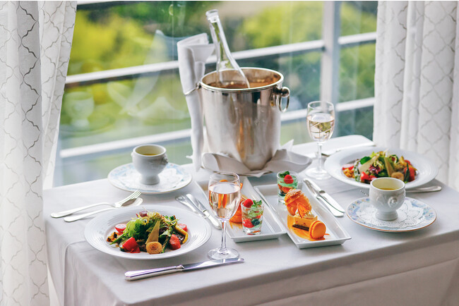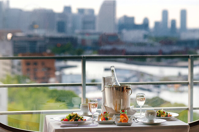 プランには、フランス産ロゼワインと、シェフが心を込めてご用意する夏野菜で彩るディナー、パティシエこだわりの可愛らしいスイーツを、ルームサービスにてご用意します。淡いピンク色が美しい夕日を思わせるロゼワインとともに、色鮮やかなメニューの数々が優雅なひとときを演出、身も心もほぐれていくような時間をお過ごしいただけます。窓に広がるみなとみらいや海、夕焼けから煌めく夜景へ変化する“横浜時間”をご覧いただきながら過ごすプライベート感たっぷりのご褒美時間を、この夏の休日にいかがでしょうか。