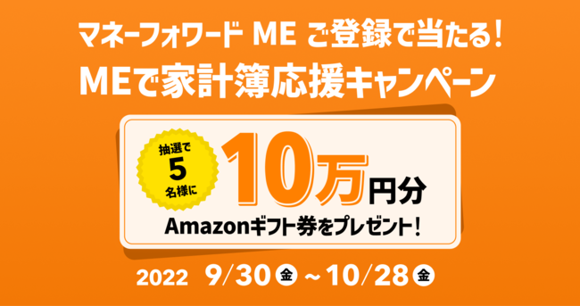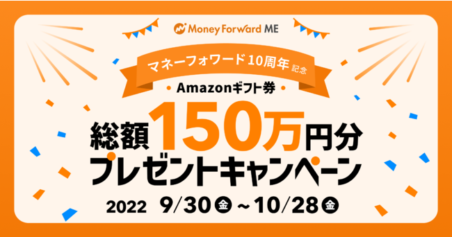 株式会社マネーフォワードは、2022年9月30日(金)より、マネーフォワード創業10周年を記念して、『マネーフォワード ME』において総額150万円分のAmazonギフト券が当たるプレゼントキャンペーンをスタートします。全3種のキャンペーンで構成され、メインキャンペーンである「『マネーフォワード ME』ご登録で当たる!MEで家計簿応援キャンペーン」では『マネーフォワード ME』にご登録の方全員を対象に、エントリーで抽選5名様に10万円分のAmazonギフト券をプレゼントします。