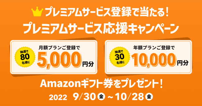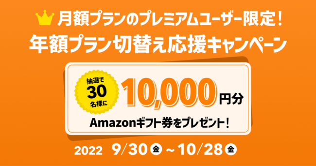 キャンペーン開始日(2022年9月30日)前からプレミアムサービス月額プランにご登録いただいている方を対象に、キャンペーン期間中にエントリーのうえ、「月額プラン」から「年額プラン」にプラン変更すると、抽選で30名様にAmazonギフト券10,000円分をプレゼントいたします。