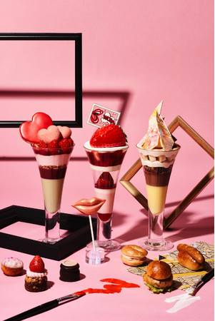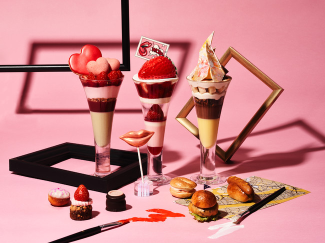 ポップアートをモチーフに、迫力ある大きなイチゴに思わず「WOW!」と驚く「WOWストロベリー」は、ムースやゼリーなど様々な味と食感でストロベリーを存分に堪能できます。ほかにも、バンクシーの「風船と少女」をモチーフにした、ジューシーで甘酸っぱいストロベリーとピスタチオムースが濃厚に絡み合う「LOVEストロベリー」、ニューヨークの街中の至る所で目に飛び込んでくる、色とりどりのウォールアートをイメージした「バナナ&チョコレート」と、感性を刺激される3種のパフェが勢揃い。