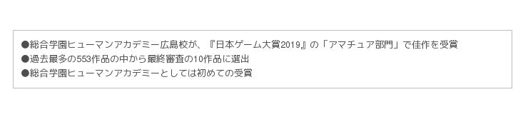 総合学園ヒューマンアカデミー ゲームカレッジ 日本ゲーム大賞2019 アマチュア部門で広島校が佳作を受賞