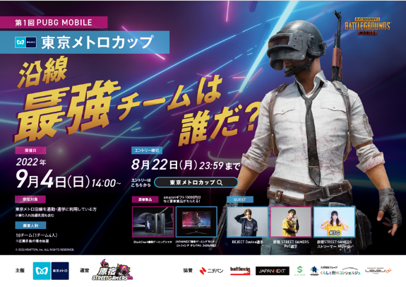 東京地下鉄株式会社(本社:東京都台東区、代表取締役社長:山村 明義、以下「東京メトロ」)と、BS放送局BS12 トゥエルビ及びプロeスポーツチーム「原宿 STREET GAMERS(以下HSG)」を運営するワールド・ハイビジョン・チャンネル株式会社(本社:東京都渋谷区、代表:須磨直樹)は、東京メトロ沿線を通勤・通学に利用している方向けのeスポーツ大会「東京メトロpresents第1回PUBG MOBILE 東京メトロカップ」を2022年9月4日(日)にオンライン開催することをお知らせいたします。