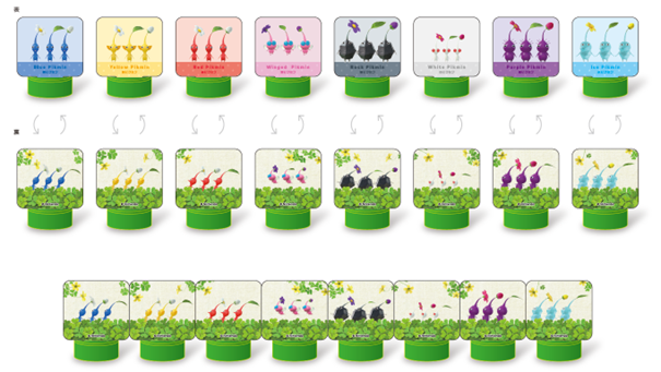 色とりどりの中から、お好きなピクミンをお選びください。集めると、繋がったイラストをお楽しみいただくこともできます。