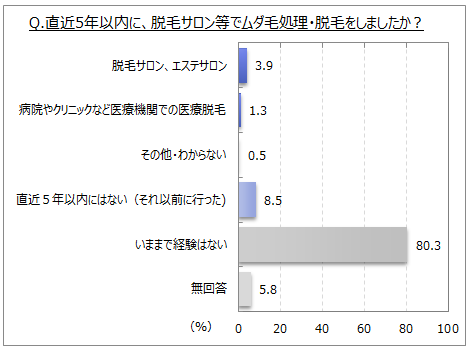 【ムダ毛処理・脱毛に関する調査】脱毛サロン等での処理経験者は1割強、直近5年以内では約5%。女性10・20代では「脱毛サロン、エステサロン」が4割弱、「医療機関での医療脱毛」が1割と比率高い