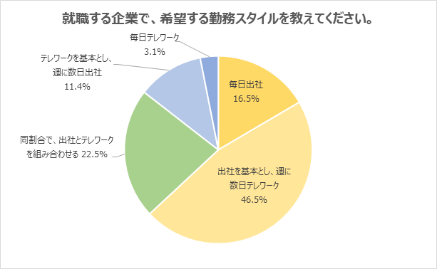 就職した企業で希望する勤務スタイルは、「出社を基本とし、週に数日テレワーク」が46.5%で最多。次いで、「同割合で、出社とテレワークを組み合わせる」22.5%、「毎日出社」16.5%が続きました。「毎日テレワーク」の回答は3.1%に留まり、多くの学生が出社の機会も得たいと考えていることが分かります。「出社して直接話したほうが、信頼関係を築けると思う」「毎日テレワークだと、コミュニケーションが図りにくいと思う」「学生時代、毎日オンライン授業だと、人と話す機会がなく精神的にきつかった。出社して直接話す機会も持ちたい」「出社する機会があるほうが、メリハリが持てる」などの声が寄せられました。人間関係を築いたり、円滑にコミュニケーションを図るために、出社して直接話す機会も大切にしたいという意向がうかがえます。