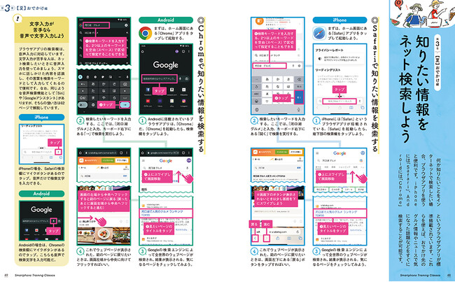 「電話、メール、LINEの使い方」から始まり、「ネット検索、Googleマップの使い方」「写真や動画の撮影」「ネットショッピング、スマホ決算」まで、4部の構成に分けて、ひとつひとつ丁寧に解説。