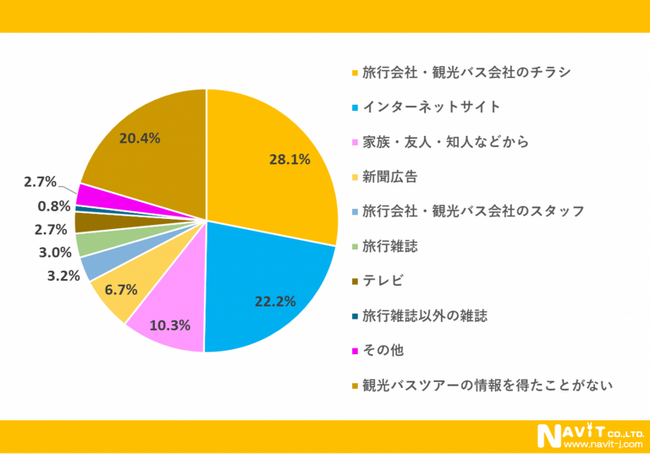 「観光バスツアーの情報をどこで得ていますか?」という質問については、「旅行会社・観光バス会社のチラシ」が28.1%、「インターネットサイト」が22.2%、「家族・友人・知人などから」が10.3%という順になりました。