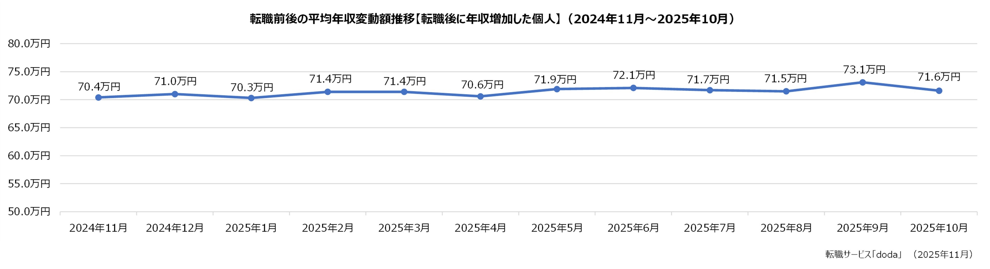 転職後に「年収増加」した個人の年収は、平均で71.6万円(前月差:-1.5万円)増加しました。