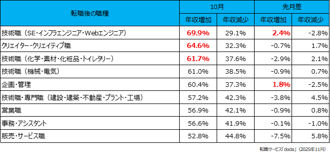 転職後に年収増加した個人が多かった職種は、「技術職(SE・インフラエンジニア・Webエンジニア)」(69.9%)、次いで「クリエイター・クリエイティブ職」(64.6%)、そして「技術職(化学・素材・化粧品・トイレタリー)」(61.7%)が続きました。[画像5: https://prcdn.freetls.fastly.net/release_image/22215/943/22215-943-716fc9279da7f850574e20a5502db18c-652x309.png?width=536&quality=85%2C75&format=jpeg&auto=webp&fit=bounds&bg-color=fff ]