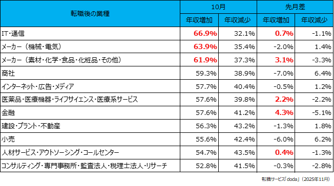転職後に年収増加した個人が多かった業種は、「IT・通信」(66.9%)、次いで「メーカー(機械・電気)」(63.9%)、そして「メーカー(素材・化学・食品・化粧品・その他)」(61.9%)が続きました。[画像4: https://prcdn.freetls.fastly.net/release_image/22215/943/22215-943-7b7d356c91acd84df815e9fb27243c64-652x364.png?width=536&quality=85%2C75&format=jpeg&auto=webp&fit=bounds&bg-color=fff ]