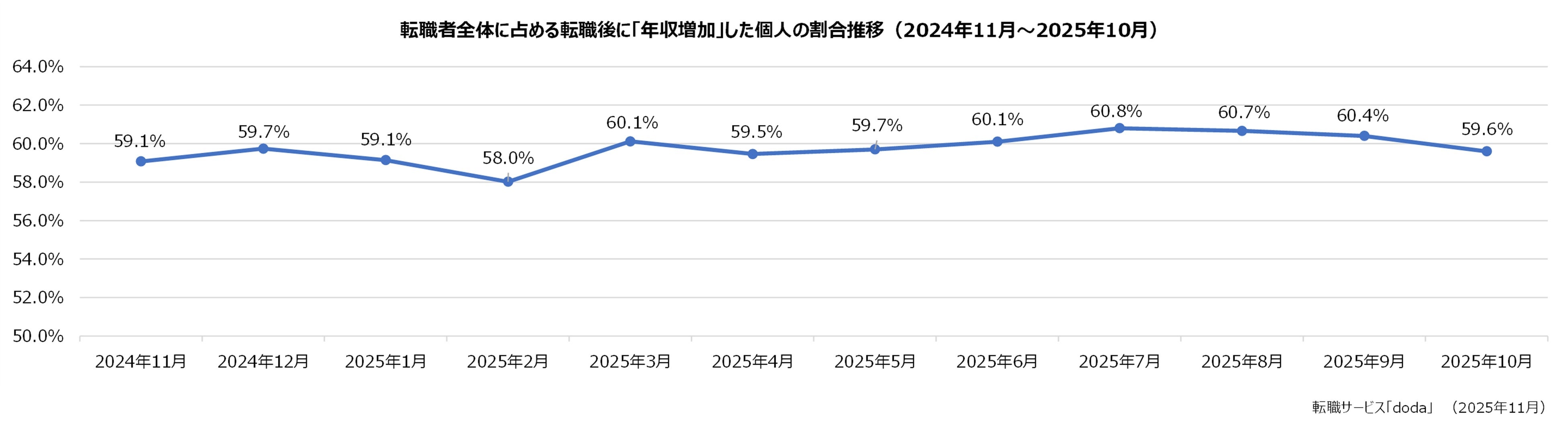 転職者全体に占める転職後に年収増加した個人の割合:59.6 %(前月差:-0.8ポイント)