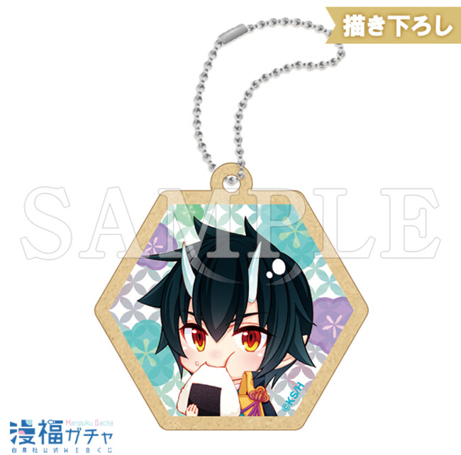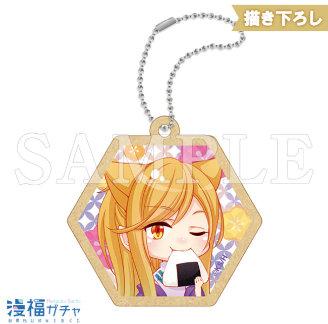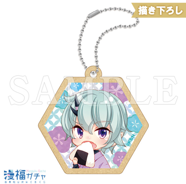 描き下ろし! 10連ごとに必ずもらえる! おにぎりを頬張るかわいいみんながウッドキーホルダーに♪