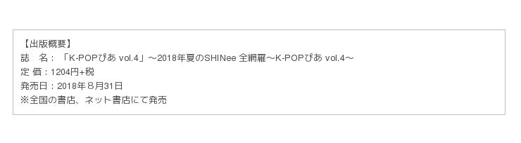 K-POPカルチャーをキャッチする、グラビア&インタビューMAGAZINE「K-POPぴあ」の第4弾(8月31日発売)の、表紙・巻頭SpecialはSHINeeが登場! この夏のSHINeeを全網羅する巻頭特集は、東京ドームでのファンイベント「SHINee WORLD J presents〜SHINee SPECIAL FAN EVENT〜」などを中心に「SUMMER STATION 音楽LIVE」、「SMTOWN LIVE 2018 IN OSAKA」、「SHINee×J-WAVE『STEP ONE』トーク&ライブイベント」までを、徹底レポートでお届け。また、SHINeeの活動・リリースを網羅したクロニクルも掲載。最新シングル『Sunny Side』をリリースしたSHINeeのこれまでとこれからを、たっぷりと感じてください。