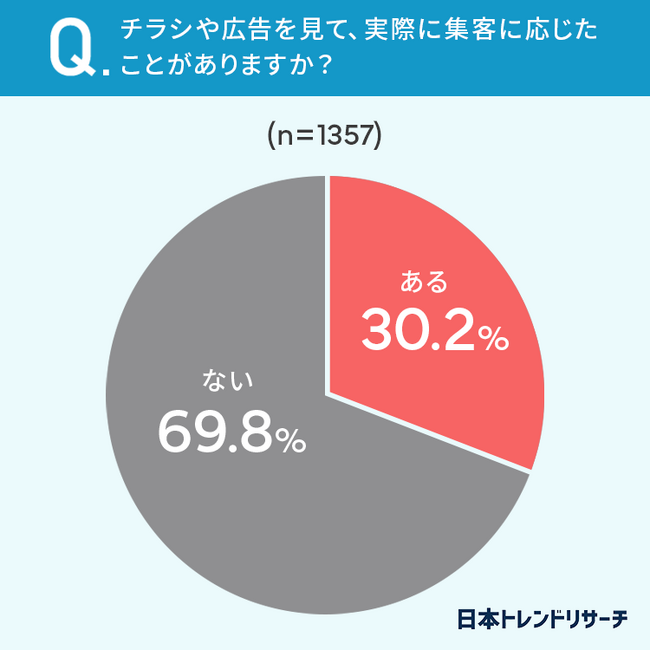 30.2%の方が、ポスティングされたチラシを見て「実際に集客に応じたことがある」と回答しています。