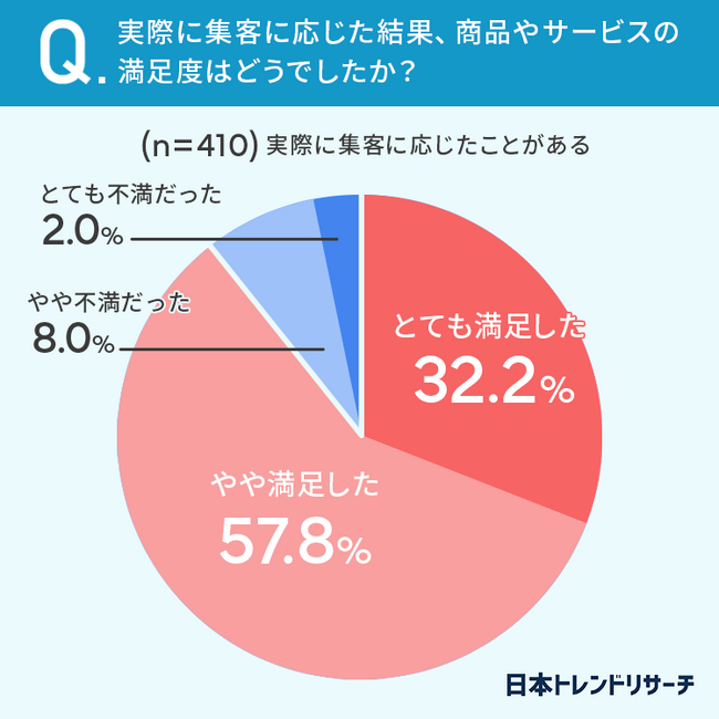 合計で9割の方が「実際に集客に応じた結果、商品やサービスに満足した」と回答しています。