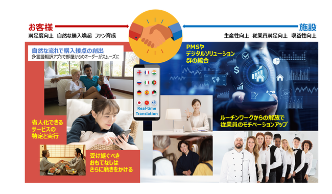 デジタルソリューションには、宿泊事業者の業務効率化や、宿泊客の密回避、利便性向上のためのサービスが多くあります。これら多くのデジタルソリューション、PMSを連携することで宿泊事業者の生産性向上に寄与し、一人ひとりがお客様に寄り添える時間の創出に貢献します。